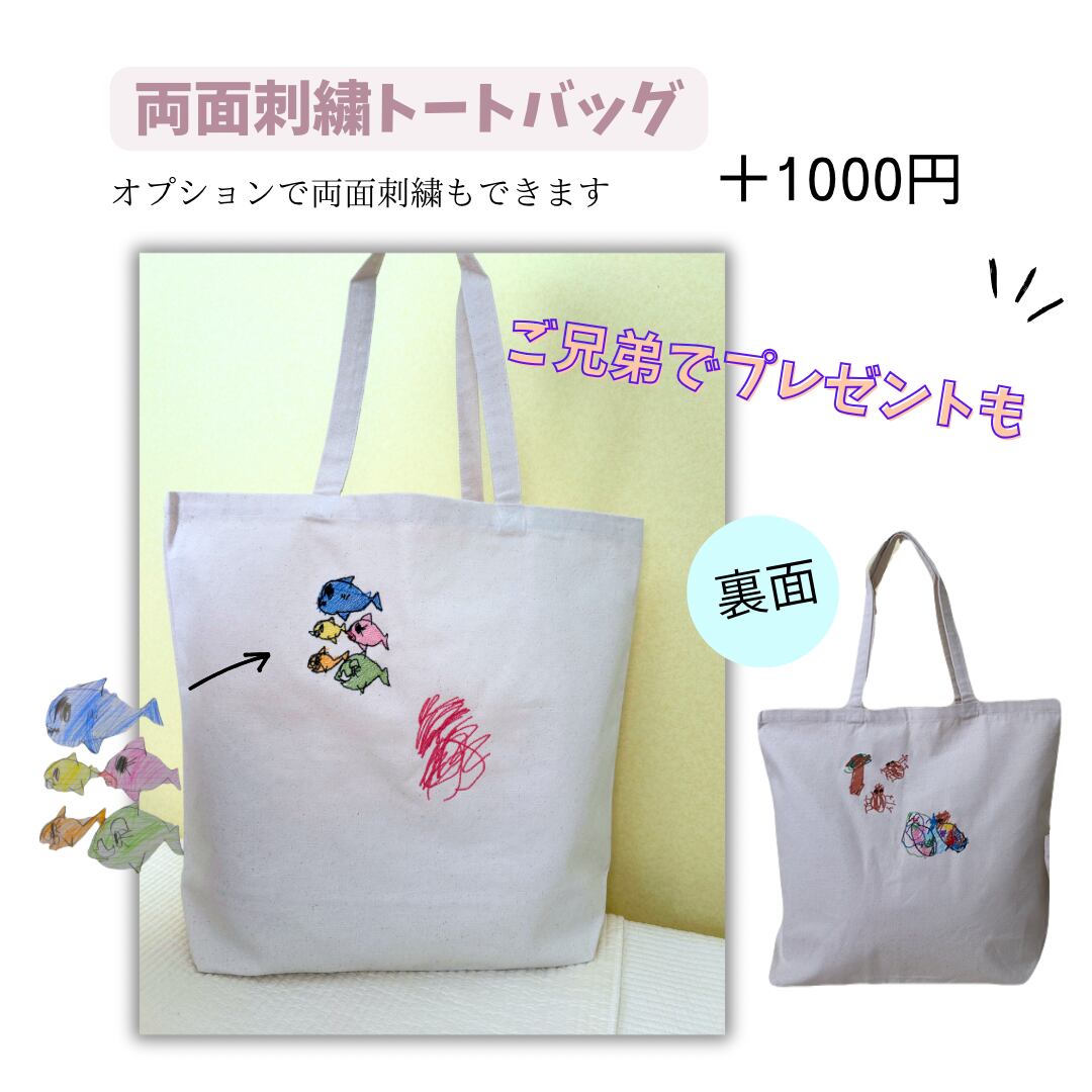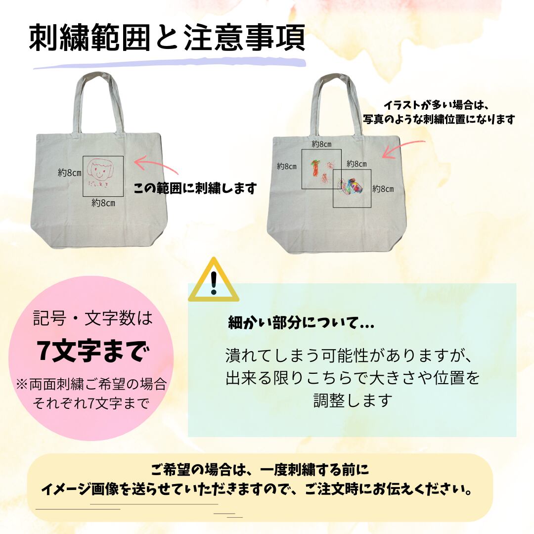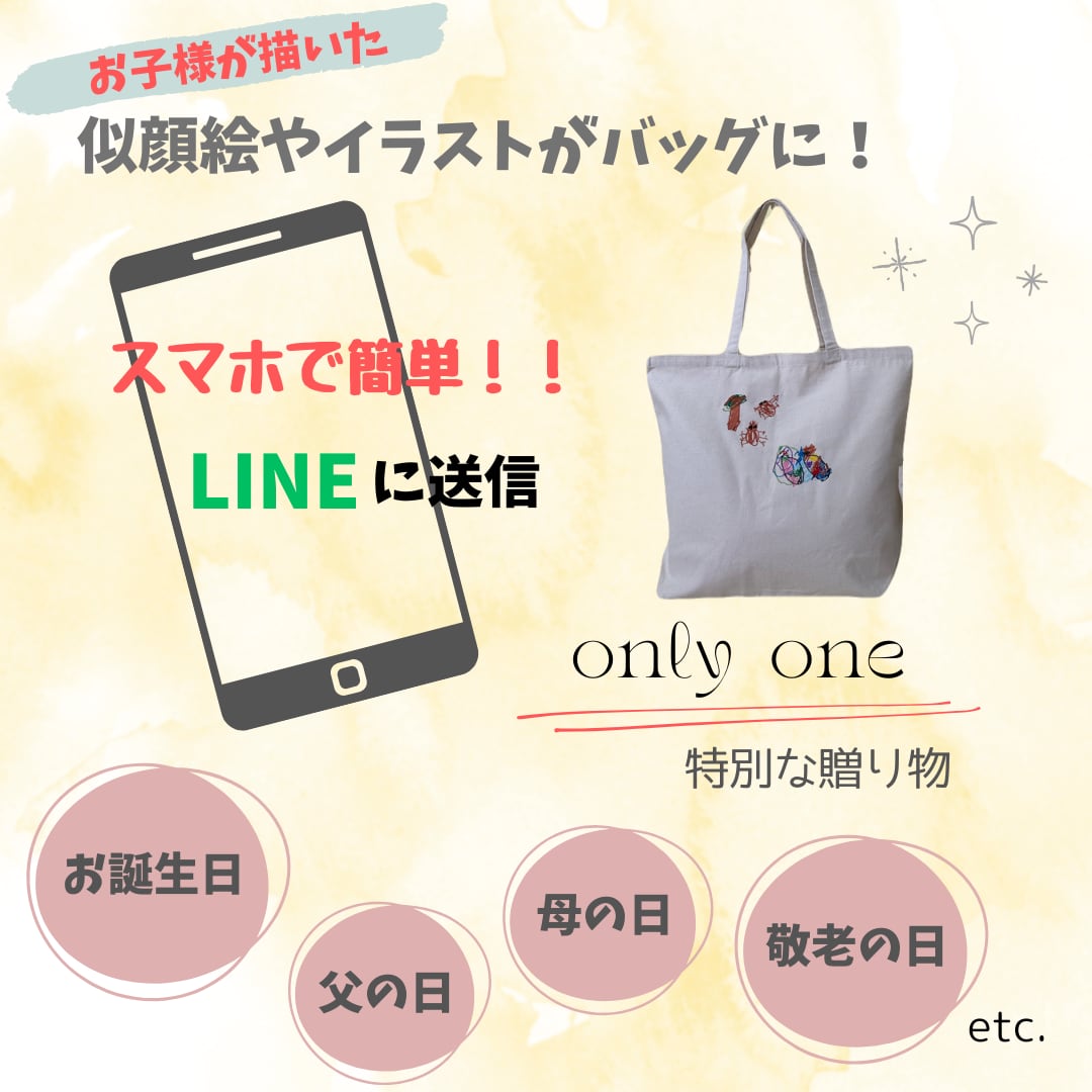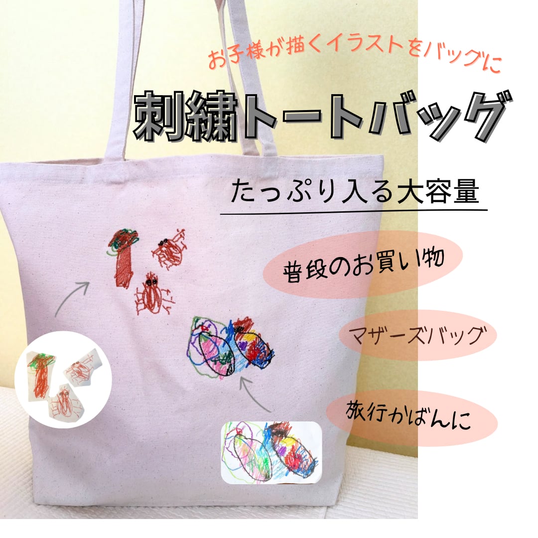 こちらは、大きめ刺繍トートバッグです。お子様が描いたイラストや似顔絵をトートバッグに刺繍します。