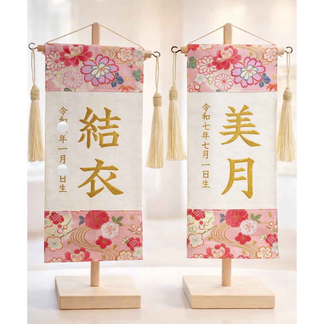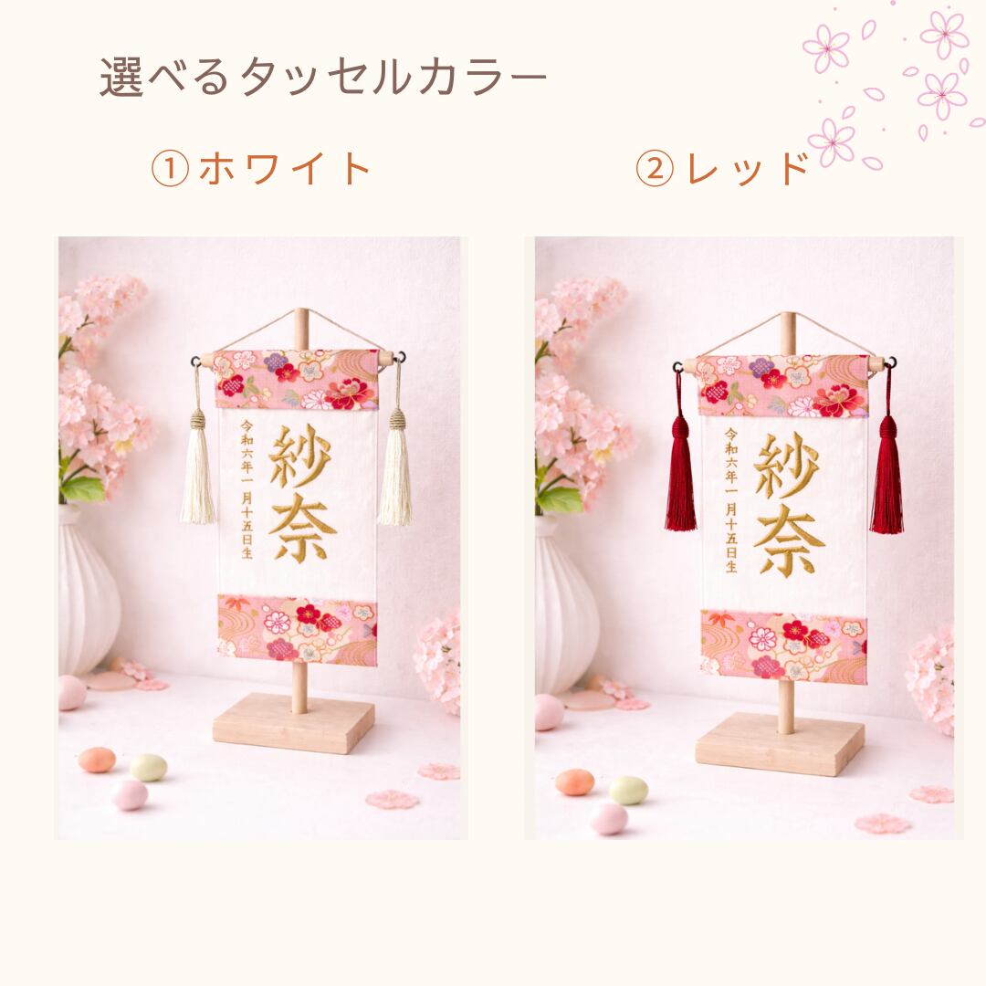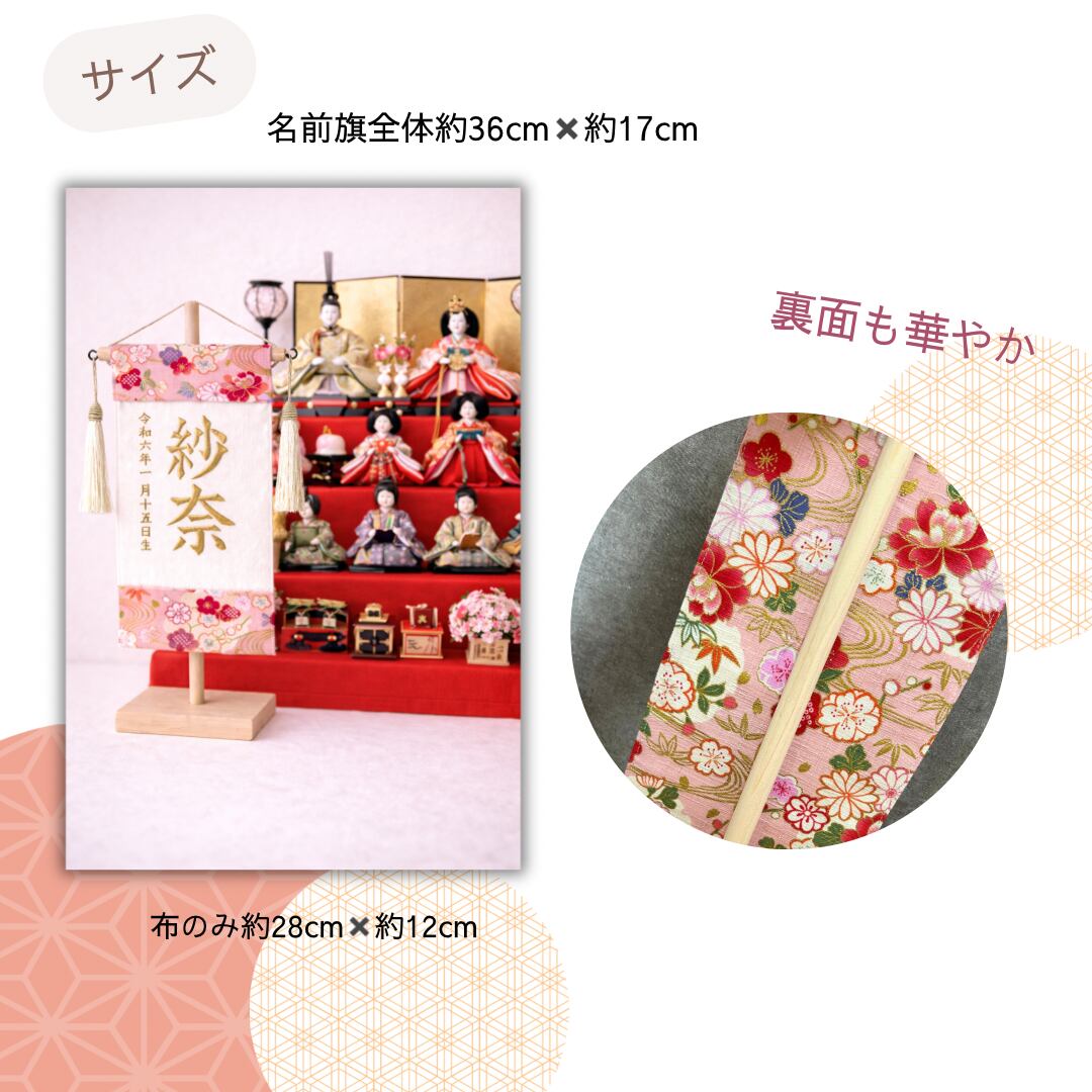 初節句に贈る ひな祭り刺繍名前旗 【和柄ピンク】木製スタンド付き