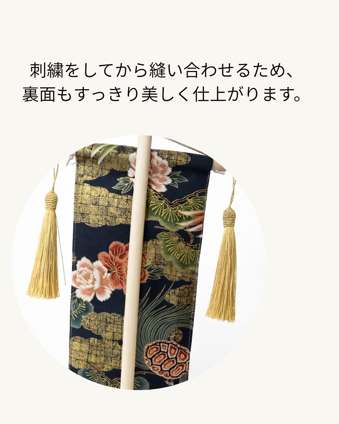 上部には、縁起の良い 鶴が描かれた華やかな和柄生地を使用しています。